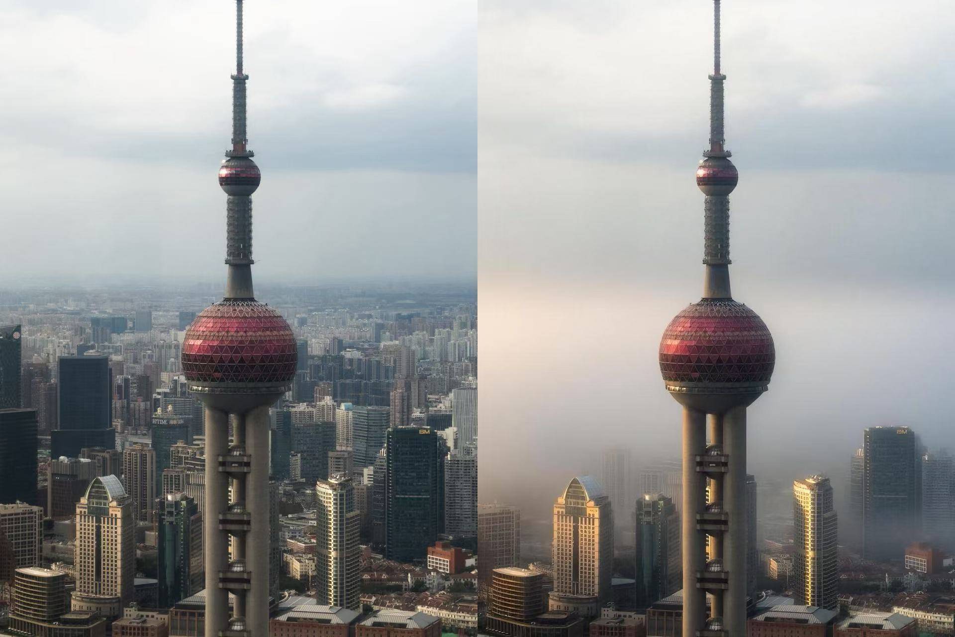 在简单交流后,AI 为这张照片按照风光摄影的修图思路进行处理,给画面添加了遮盖无用细节的平流雾,让其覆盖较低的楼房,营造出朦胧氛围;