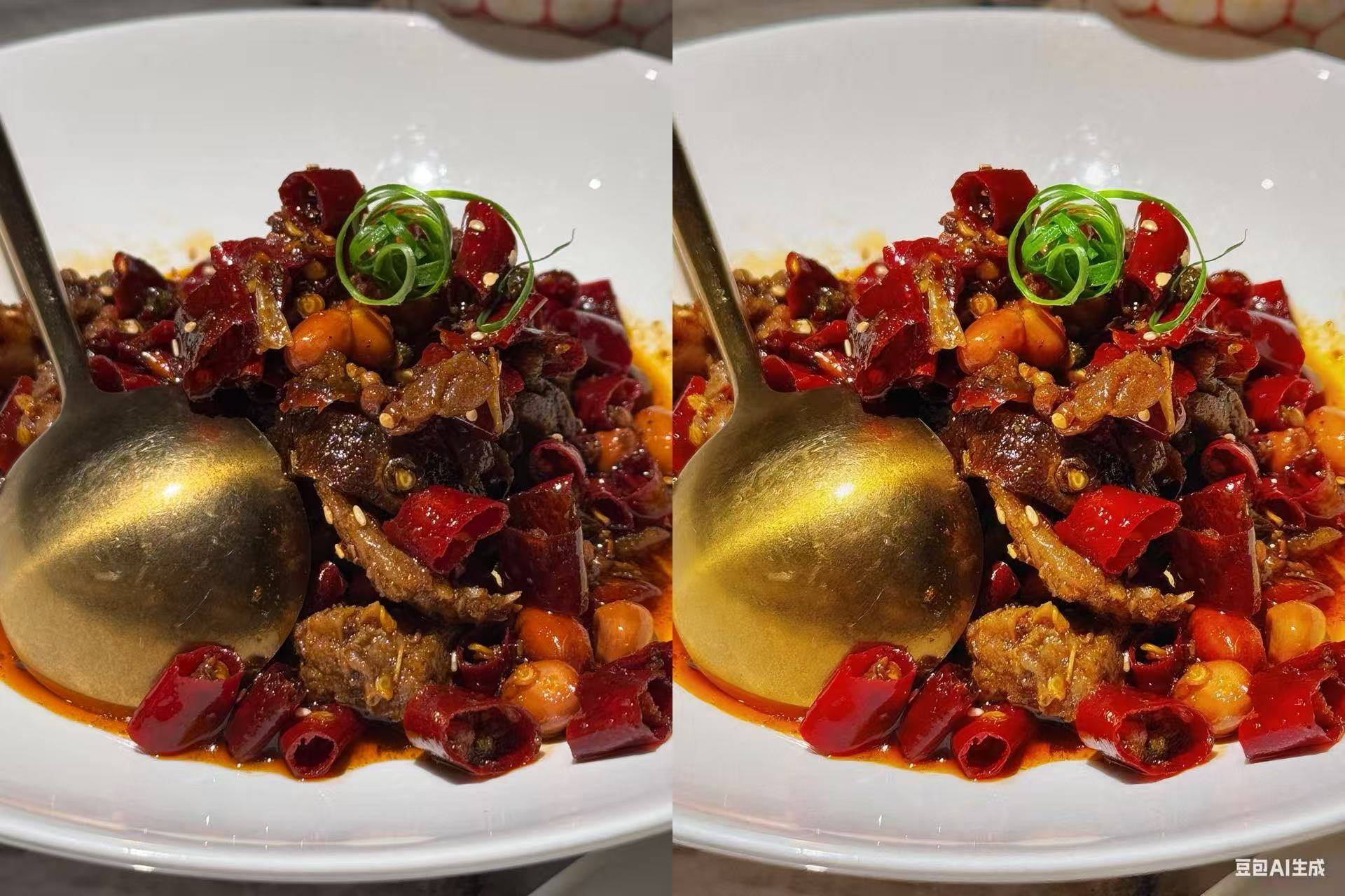 润色后的照片层次更为分明——冷吃兔与鸡肉裹满红亮油润的酱汁,表面铺满鲜红辣椒段,点缀其间的金黄花生米酥脆诱人,视觉与味觉的冲击感扑面而来,瞬间唤起食欲。