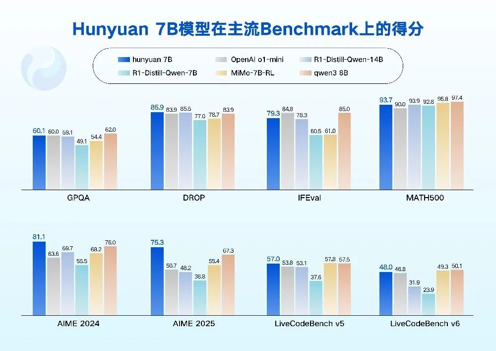 在性能上,Hunyuan 7B在不仅在数学能力上超越了OpenAI o1-mini和Qwen3-8B,在除IFEVal榜单外,均超越OpenAI o1-mini。