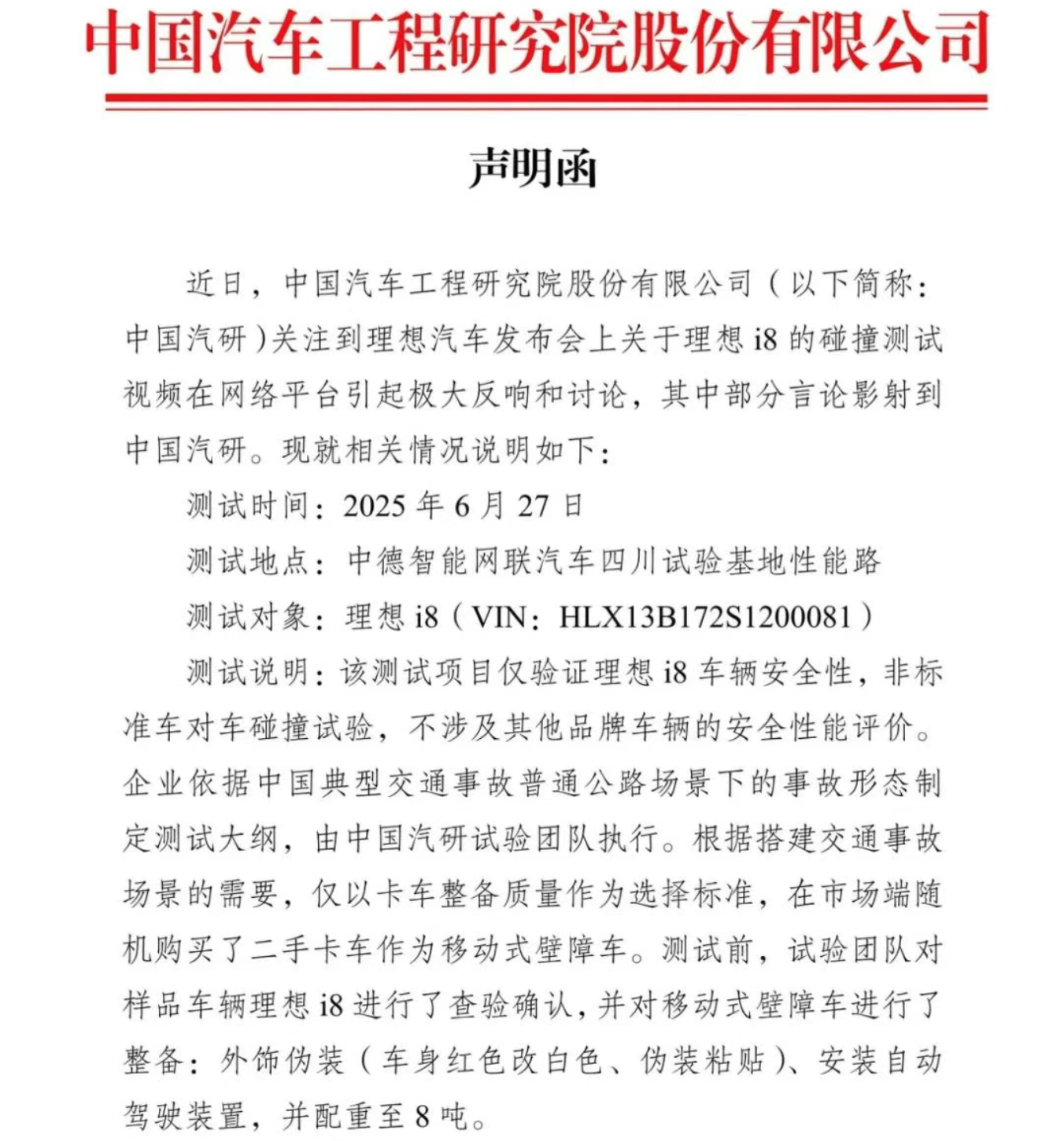 与此同时,测试的委托机构中国汽研也发表声明说,该测试项目仅验证理想i8 车辆安全性,不涉及其他品牌车辆的安全性能评价,乘龙卡车是其在市场端随机购买的二手车辆,测试前仅对车辆做了伪装并配重至了 8 吨。