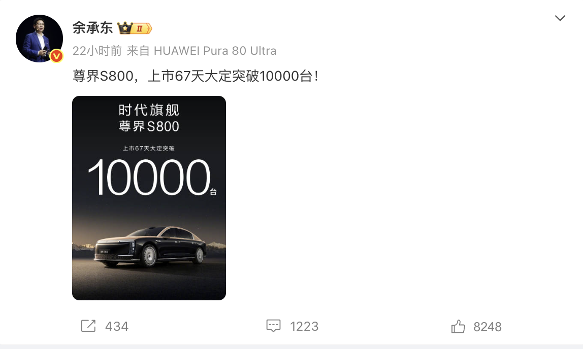 昨日,华为常务董事、终端 BG 董事长余承东发文宣布,尊界 S800 上市 67 天大定突破 10000 台。另据鸿蒙智行 8 月 1 日消息,尊界 S800 上市 50 天大定突破 8000 台。