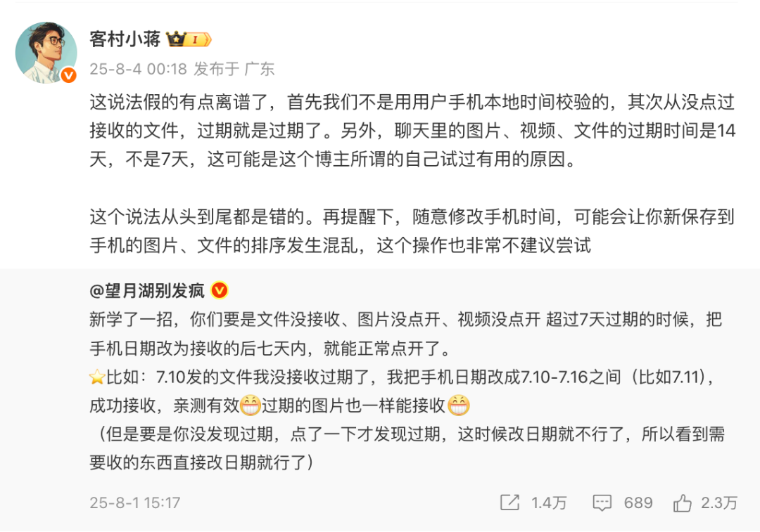 小蒋还补充,「聊天里的图片、视频、文件的过期时间是 14 天,不是 7 天」,其认为,这可能是这个博主所谓的自己试过有用的原因。