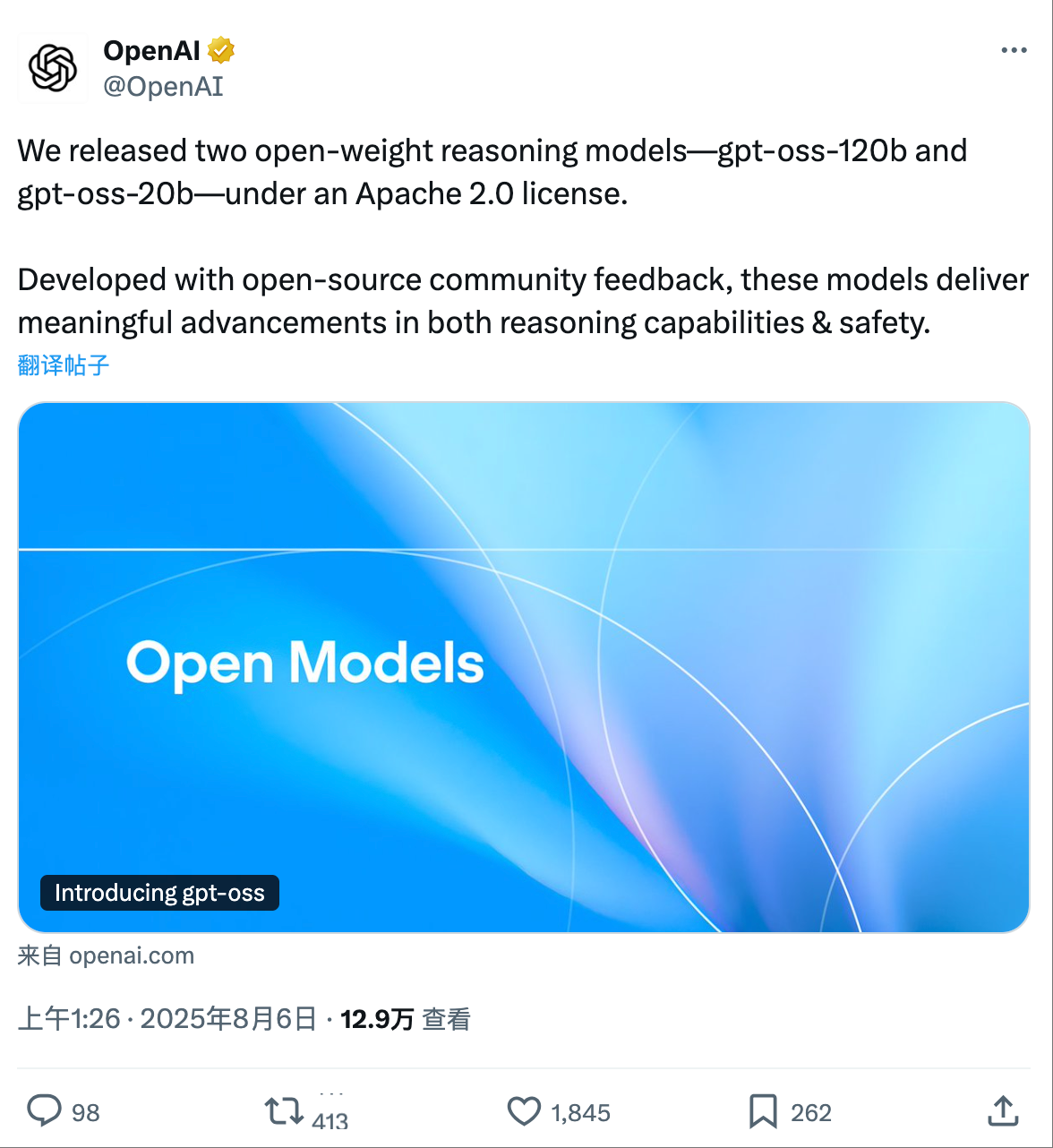 今日深夜,OpenAI 再次“open”,发布了两款高性能开源语言模型:gpt-oss-120b 和 gpt-oss-20b,在低成本下实现了出色的推理能力和工具使用能力,并针对消费级硬件进行了优化。两款模型均采用 Apache 2.0 许可证,具备高度可部署性和灵活性。