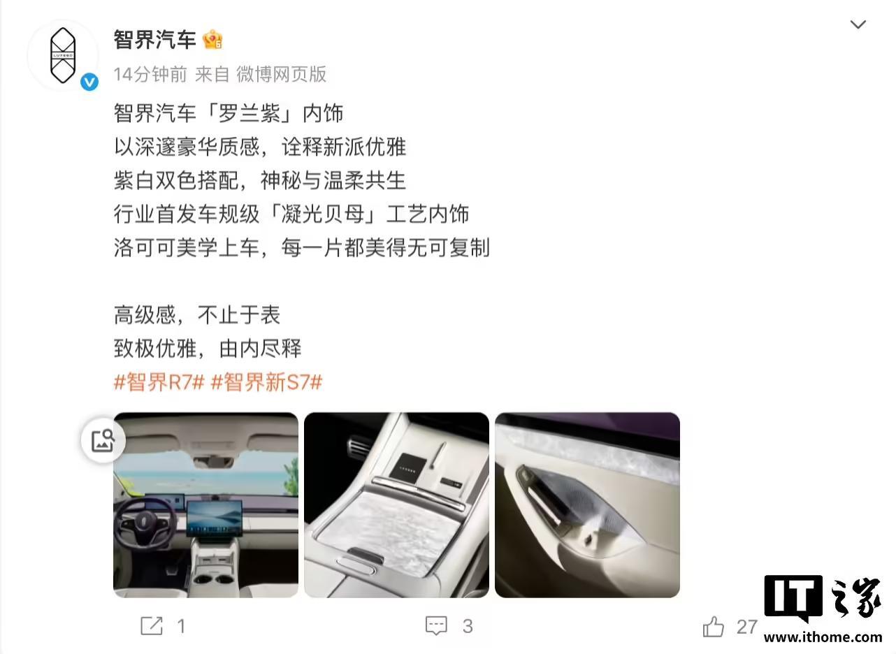 IT之家 8月6日消息,今天上午宣布了全新的“罗兰紫”内饰,以深邃的豪华质感诠释“新派优雅”。从官微发布的 tag 来看,该配色有望在鸿蒙智行智界新款 R7、S7 上首发搭载。