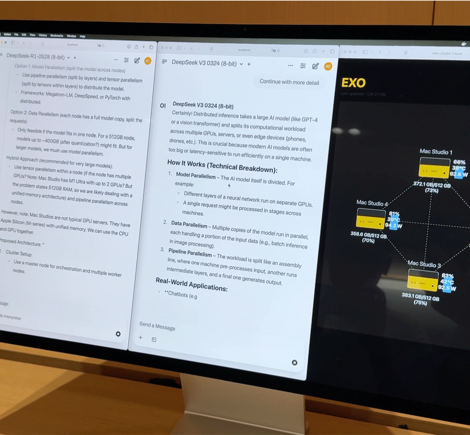 这样的组合,几乎是一台家用级别的小型超算。但硬件只是基础,真正发挥效能的关键是 EXO Labs 开发的分布式模型调度平台 Exo。Exo 会根据内存与带宽状态将模型自动拆分,部署在最合适的节点上。