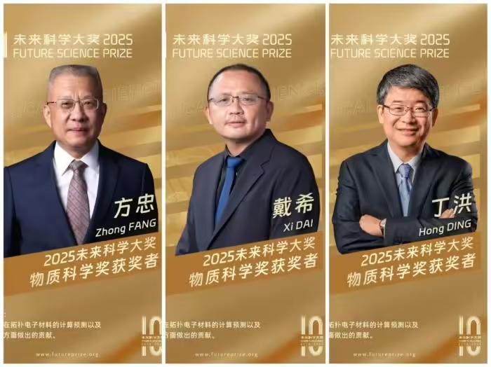 “物质科学奖”授予三位科学家,他们分别是来自中国科学院物理研究所的方忠、香港科技大学的戴希和上海交通大学李政道研究所的丁洪,表彰他们在拓扑电子材料的计算预测以及实验实现方面作出的贡献。