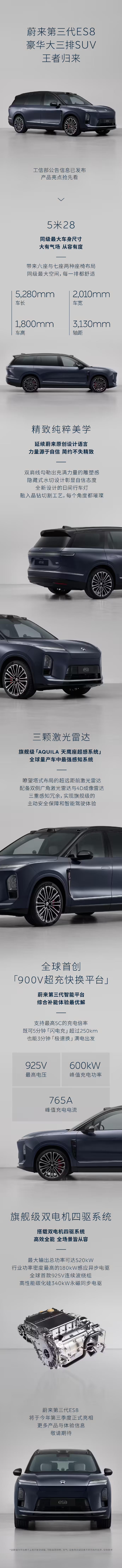 IT之家注意到,在外观设计上,结合此前工信部给出的证件照,全新蔚来 ES8 车头部分经过重新设计,棱角更加分明,灯组造型进行了调整,通风口被巧妙地移至大灯下方,下部格栅边框造型更加立体,整体视觉效果更具冲击力。车身尺寸方面,全新蔚来 ES8 的长宽高分别为 5280×2010×1800mm,轴距 3130mm,相比现款车型有显著提升。车尾部分延续了横贯式灯组设计,但灯组更加厚重,使得尾部看起来更加圆润饱满。