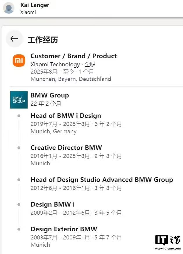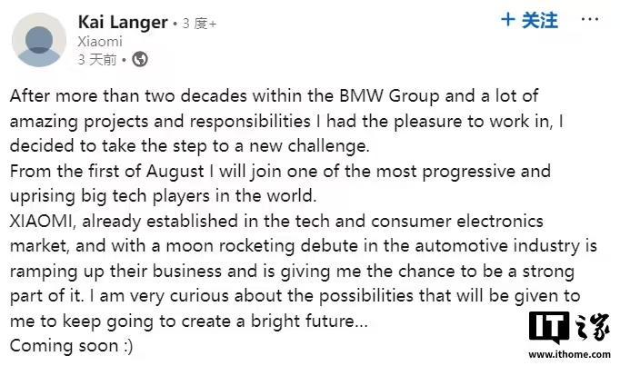 IT之家 8 月 6 日消息,宝马 i 系列设计主管 Kai Langer 上周末在领英发文宣布,在宝马集团工作了二十多年之后,从 8 月 1 日起,他已加入“世界上最进步、最崛起的大型科技公司之一”—— 小米。