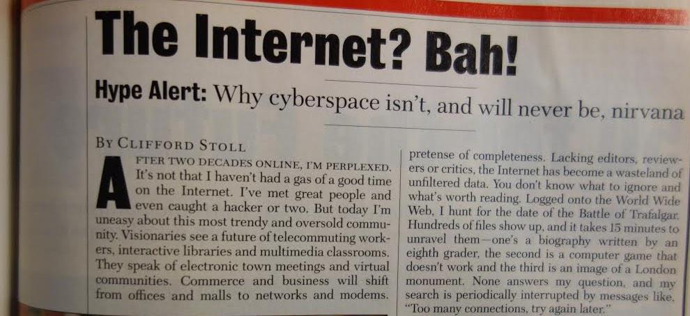 1995年2月,《新闻周刊》在标题里更是直接开大,互联网?我呸!(Internet ? Bah!)。这文章还认为在线购物和网络社区有违常识,都是不切实际的幻想,觉得在线数据库不会取代报纸。