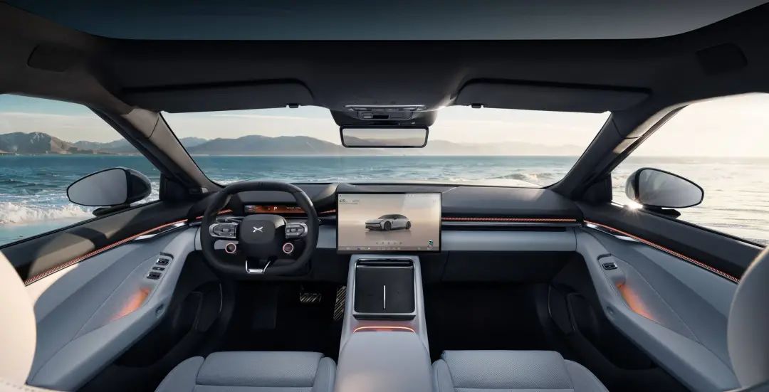 全新 P7 的「科技感」IP 仪表台融合了 AR-HUD、运动仪表屏、三轴联动屏、Touch Pad 以及优化过的三幅运动方向盘和流水动态氛围灯。
