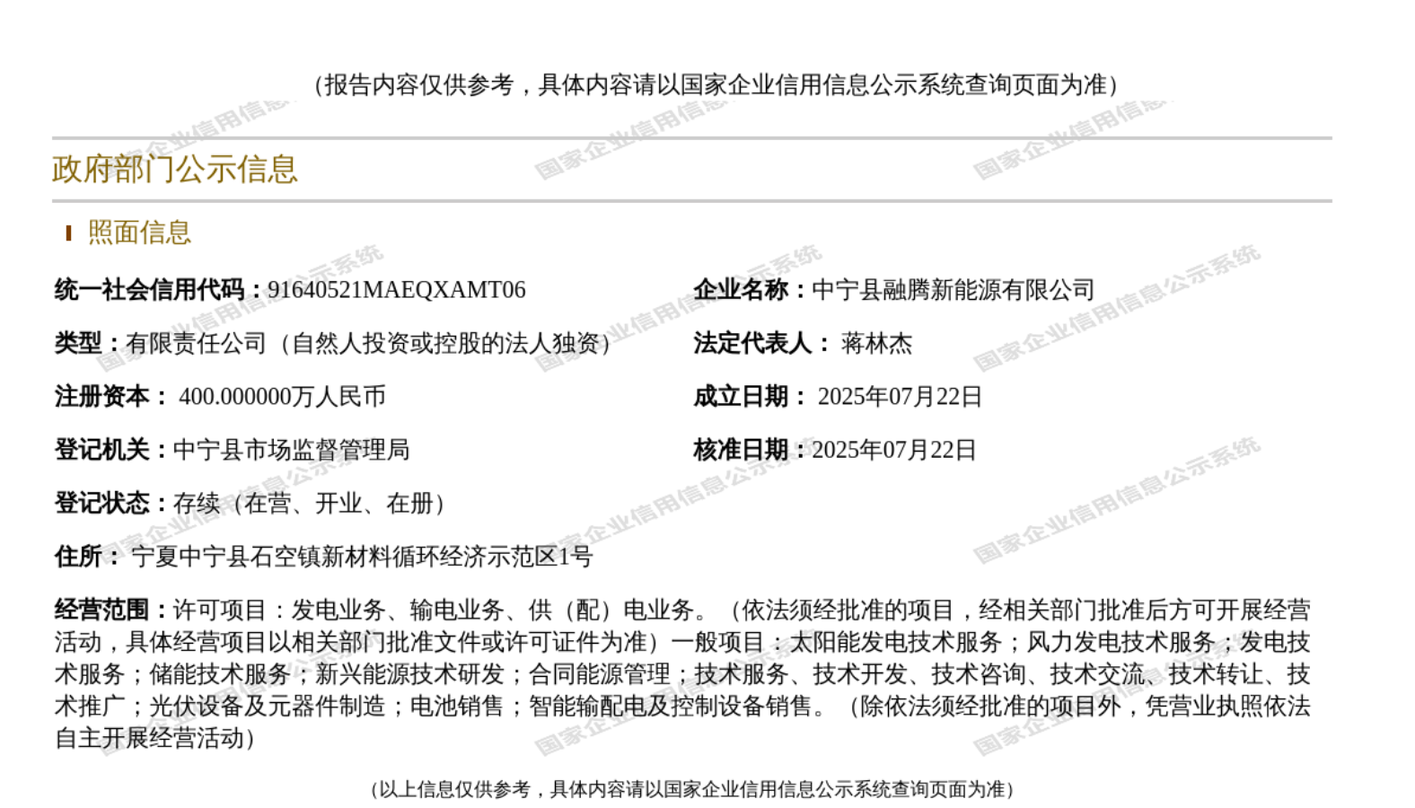 凤凰网科技讯 8月7日,天眼查工商信息显示,近日,中宁县融腾新能源有限公司正式成立。该公司法定代表人为蒋林杰,注册资本达400万人民币,在新能源相关领域布局多个业务板块。