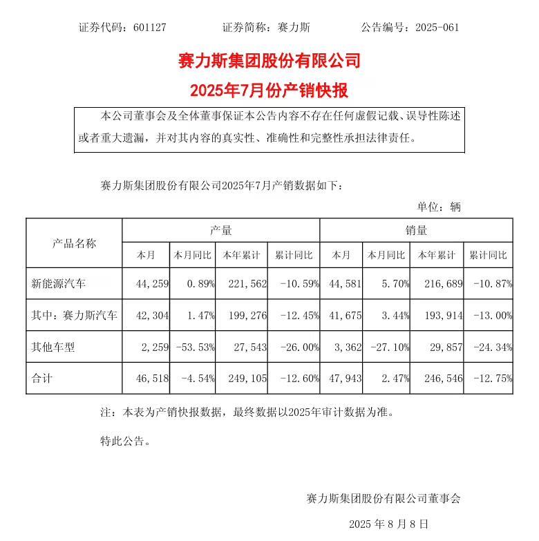 IT之家 8 月 7 日消息,赛力斯今日公告称,2025 年 7 月新能源汽车销量为 44581 辆,同比增长 5.70%;1-6 月累计销量为 216689 辆,同比下降 10.87%。