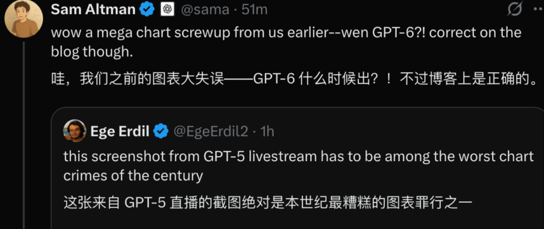 发布会(录播)期间一直在 live tweet 的山姆·奥特曼,也发现了这个问题。他只能尬回一句:「看来要 GPT-6 才能搞定了,不过在官方博客上是没有错的。」