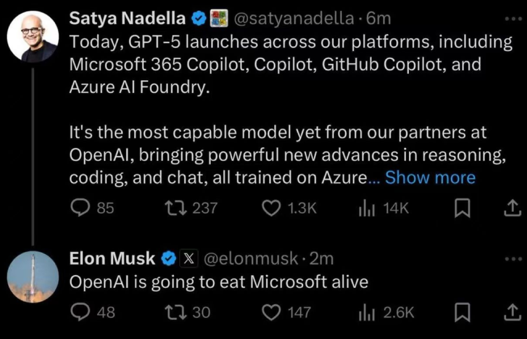 GPT-5发布会后,微软CEO纳德拉友情发帖表示支持,却被马斯克第一时间「嘲讽」。(但很快就删帖了)