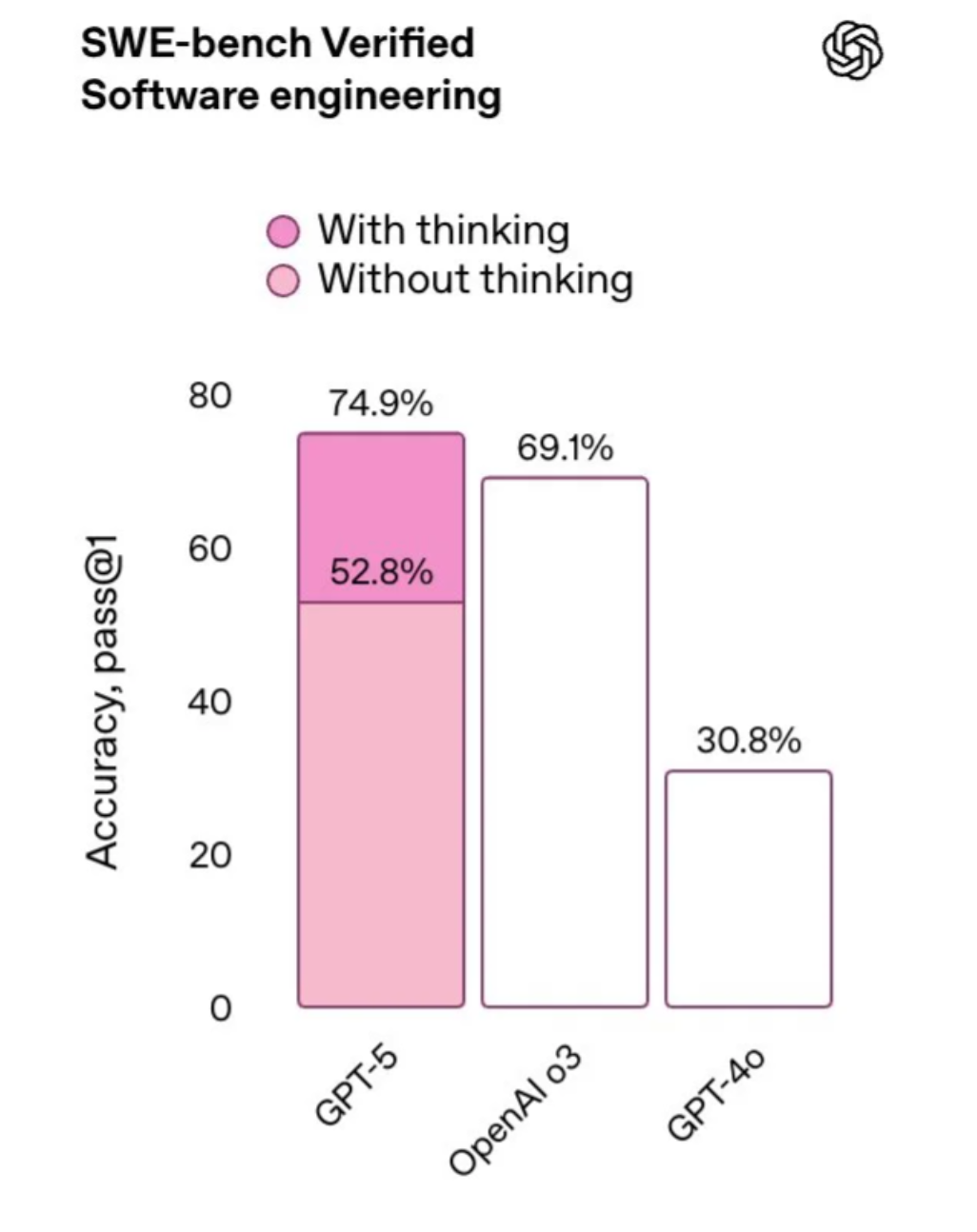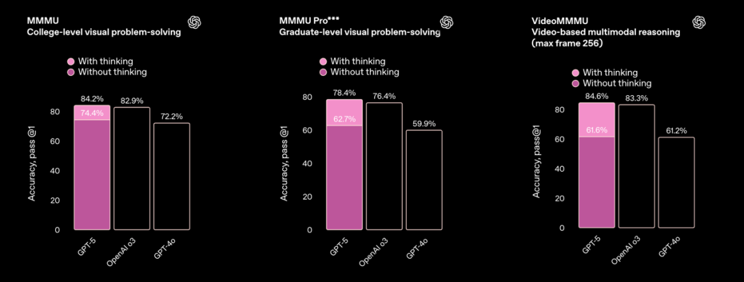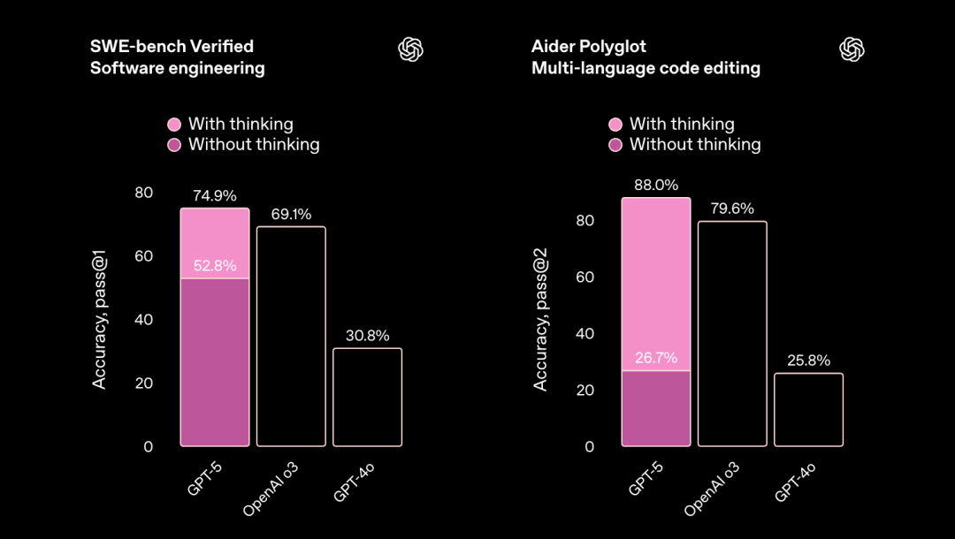 其次就是编程能力,相较于o3和4o,GPT-5在思考模式加持之下,达到了74.9%的水平。