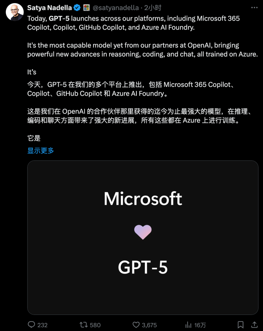 不过另一方面,老东家微软CEO火速出面站台,并配有一个“爱心”图片以表支持: