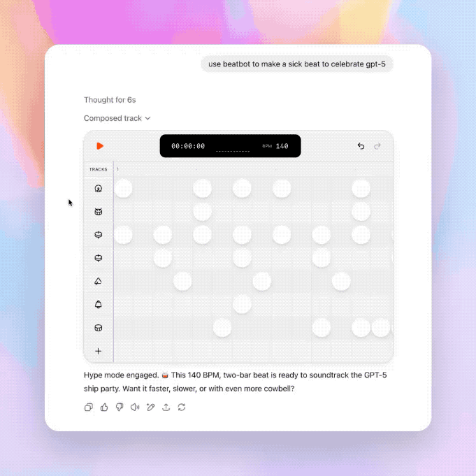 并且Altman还表示,有GPT-5权限的用户,只需发送“use beatbot to make a sick beat to celebrate gpt–5”即可体验。