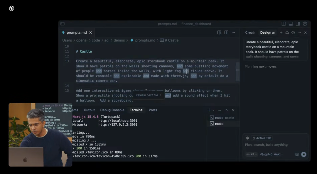对于更加庞大且复杂的项目,例如现场OpenAI展示了用GPT-5先编程出来的代码:
