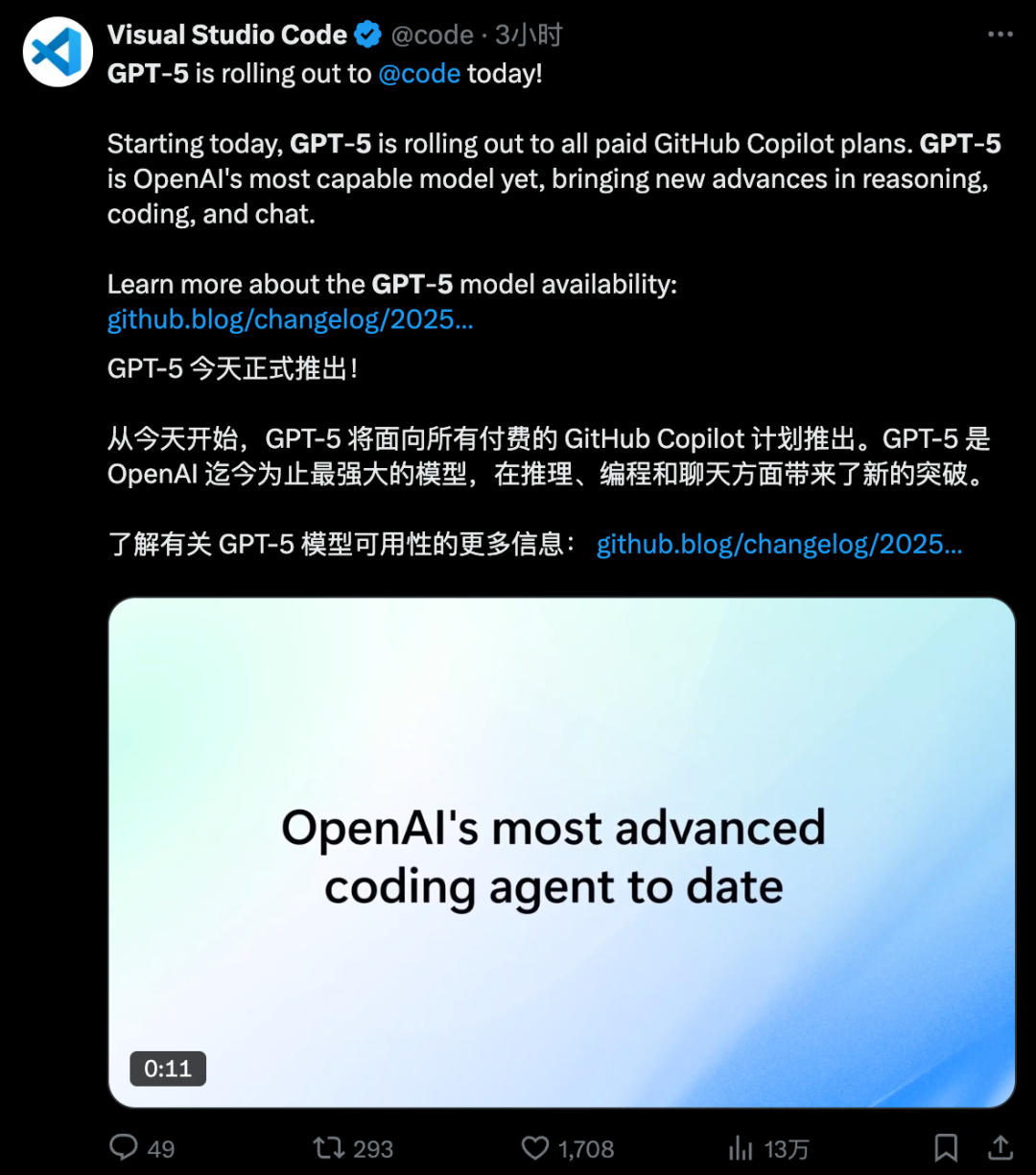 再如开发者们常用的VS Code,官方也是Day 0无缝衔接GPT-5: