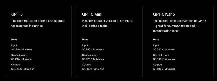 面向企业客户则出现了明显的低价抢市场。根据官网消息,标准版 GPT-5:输入 1.25 美元 / 百万 token,输出 10 美元 / 百万 token,比 GPT-4 时代普遍低 30–50%。mini 与 nano 再砍一刀,分别低至 0.3 美元和 0.05 美元 / 百万 token,几乎逼近自托管成本。