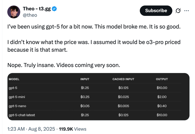 显然,新的价格让这些“苦o3久矣”的开发者们十分满意,当GPT-5标准版仅为Claude 4 Opus十二分之一价格时,那些靠“性价比”立足的平替厂商将面临生存危机。