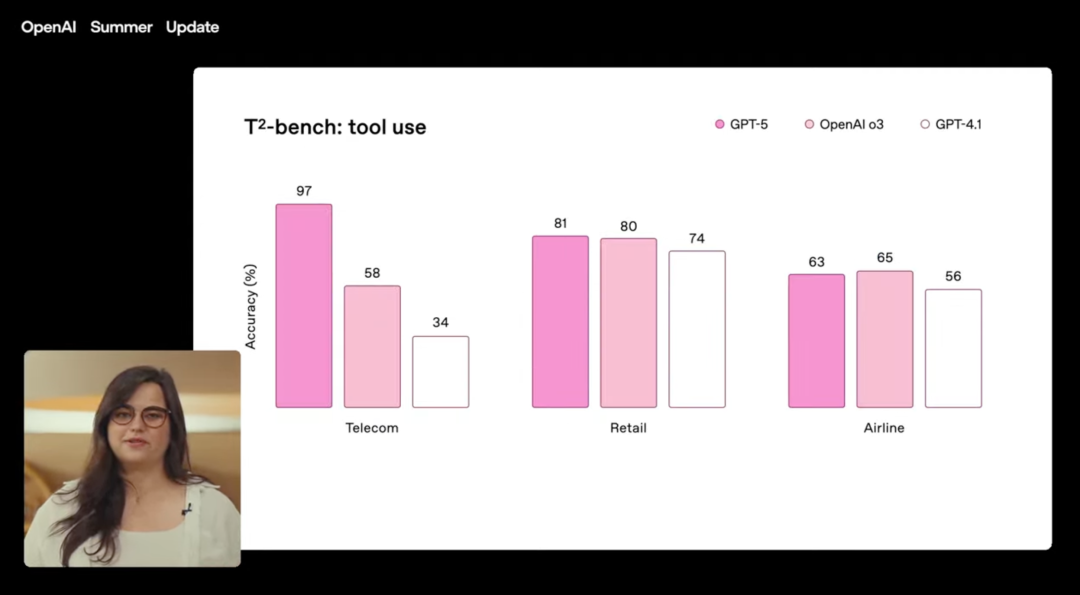 在智能体工具调用方面,两个月前,还没有一款模型在T²-bench上得分超过49%。而今天,GPT-5直接刷爆纪录,拿下了97%高分。