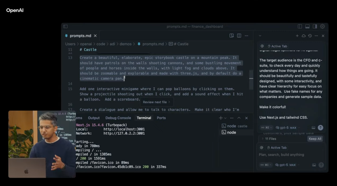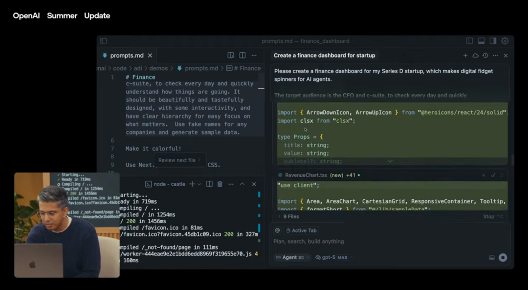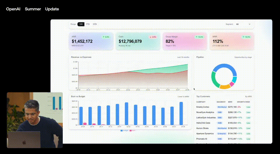 第一个用于工作演示中,GPT-5仅在5分钟完成了一个公司数据可视化的仪表盘。在此过程中,它还会自主修复bug,纠正错误。
