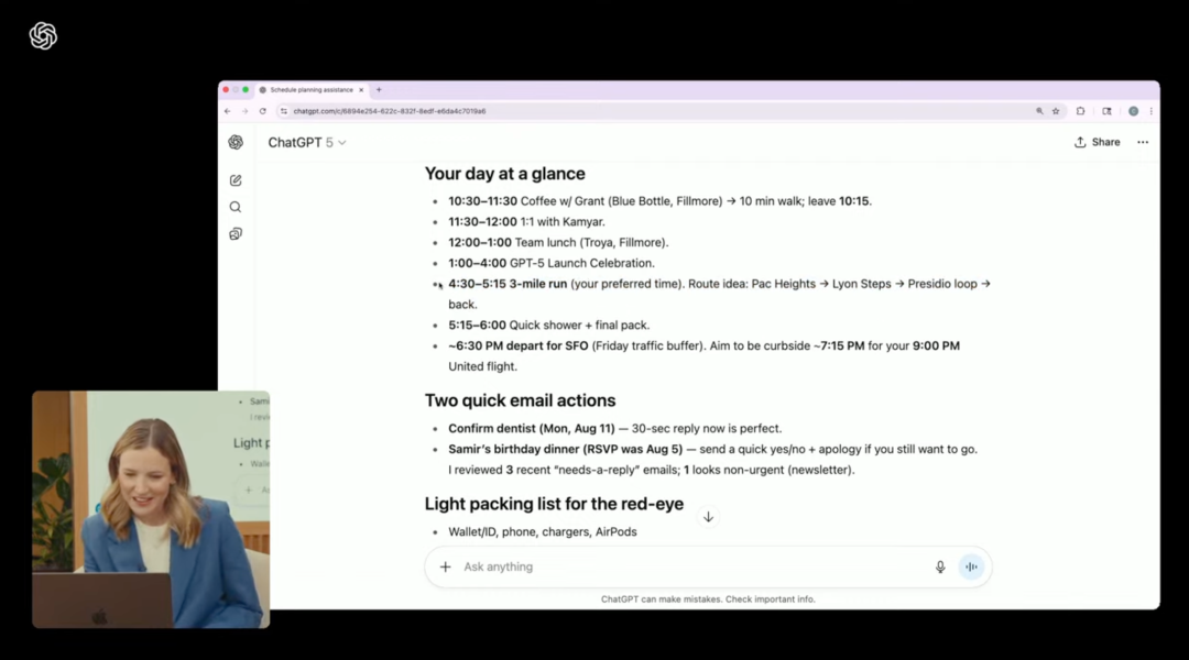 而记忆功能的升级,让GPT-5可以记住你是谁、你喜欢什么、你喜欢它是什么样子,从而更智能地预测你的需求。