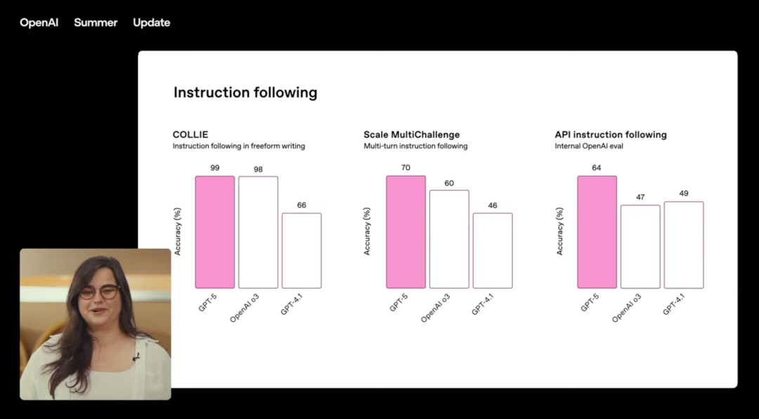 在指令遵循上,GPT-5也是OpenAI所有模型中,最领先的一款。尤其是,在内部构建的API指令遵循基准上,新模型拿下了64%亮眼成绩,远高于o3的47%。