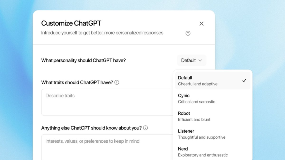 并且,GPT-5现在更有性格了,它可以更支持性、更专业简洁,甚至说话略带讽刺,一切都随我们选择。