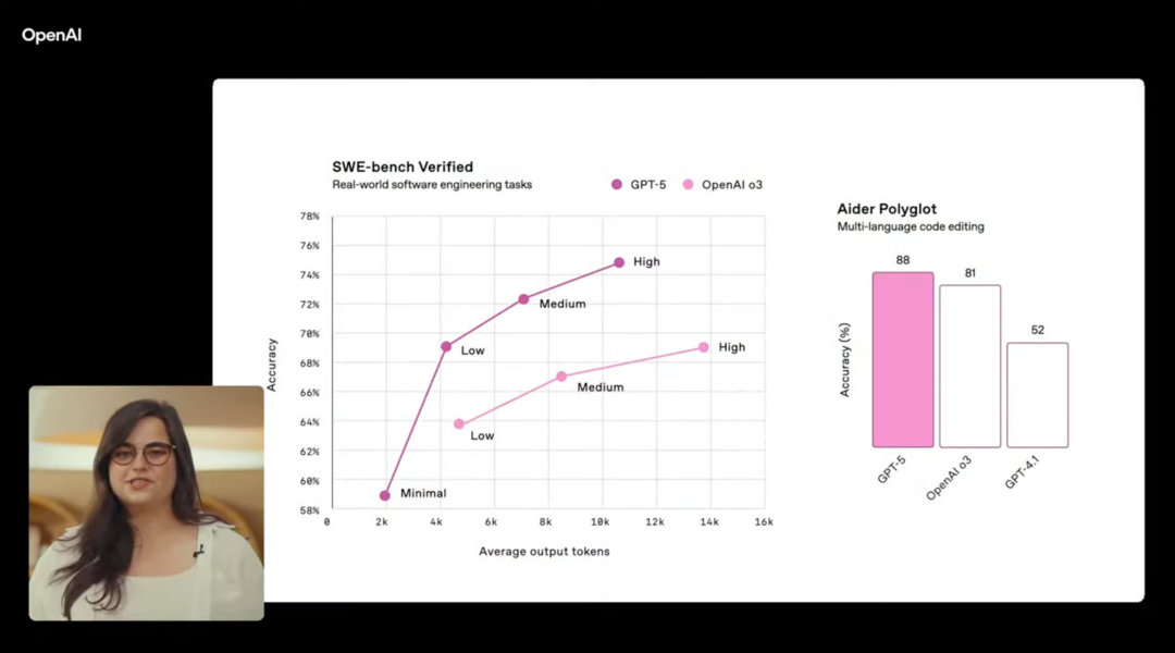 首先,GPT-5是最好的编码模型,在SWEBench上直接刷新了历史最高分,这表明它在现实工程场景中性能超强。