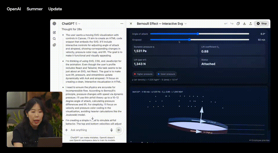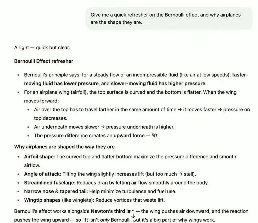 假如我们需要了解物理学中的伯努利效应,就可以要求GPT-5解释,并且回答飞机为什么是这样的形状。