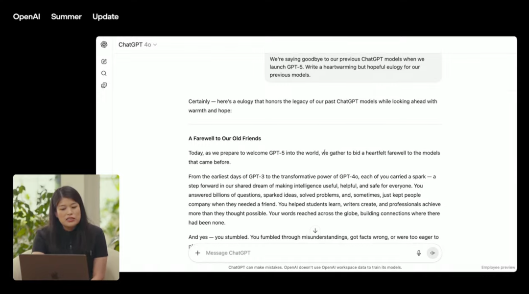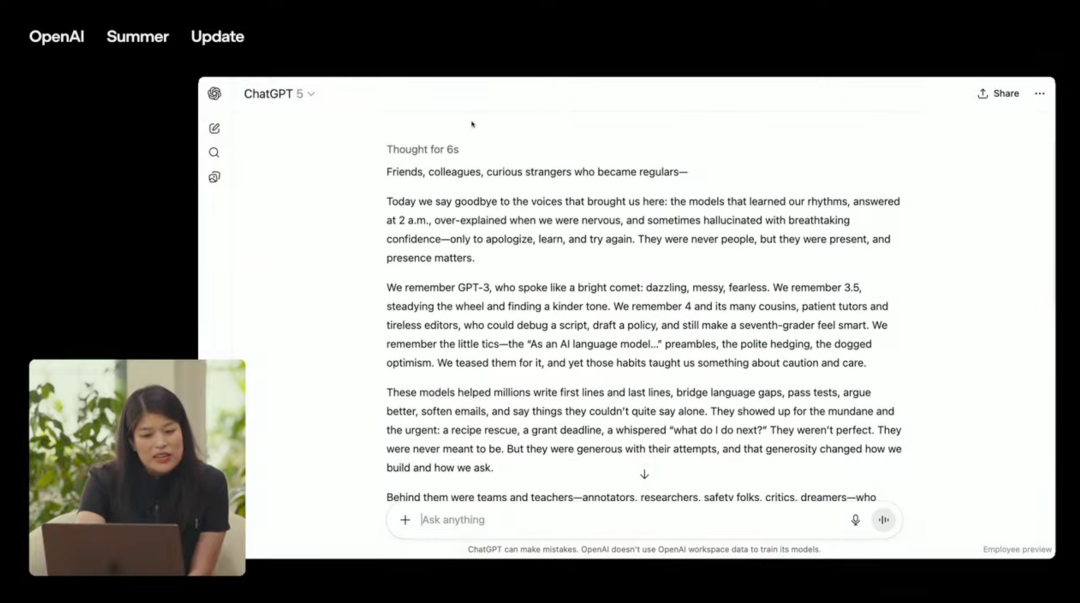 但GPT-5就不一样了!它这样开篇:「致所有曾经是陌生人,如今成了老朋友的你们……」写作有感情、有画面、有温度。