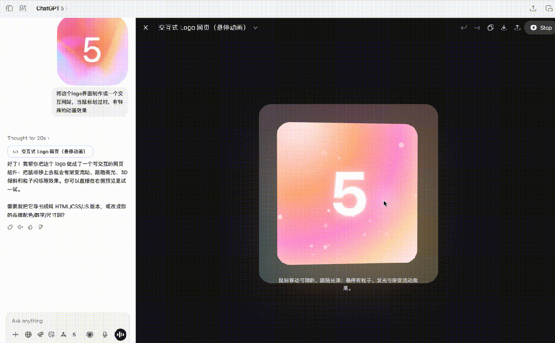 甚至,还可以用GPT-5将logo变成动态效果,几乎秒出。