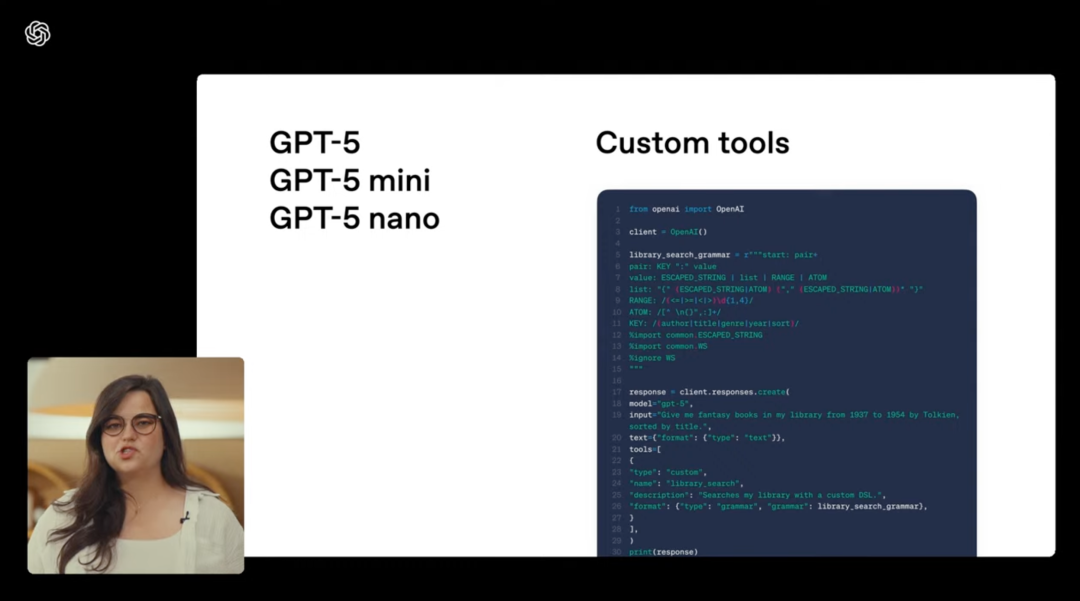 此外,OpenAI还为API带来了一些新功能,比如自定义工具(Custom Tools)、工具调用前言(Tool Call Preambles)、详细度(verbosity)参数。