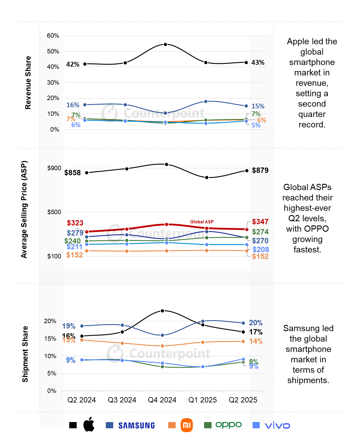 2025 年第二季度全球智能手机平均售价(ASP)达到同期历史最高水平,同比增长 7%,其中 OPPO 在五大品牌中 ASP 增幅最大,达 14%。