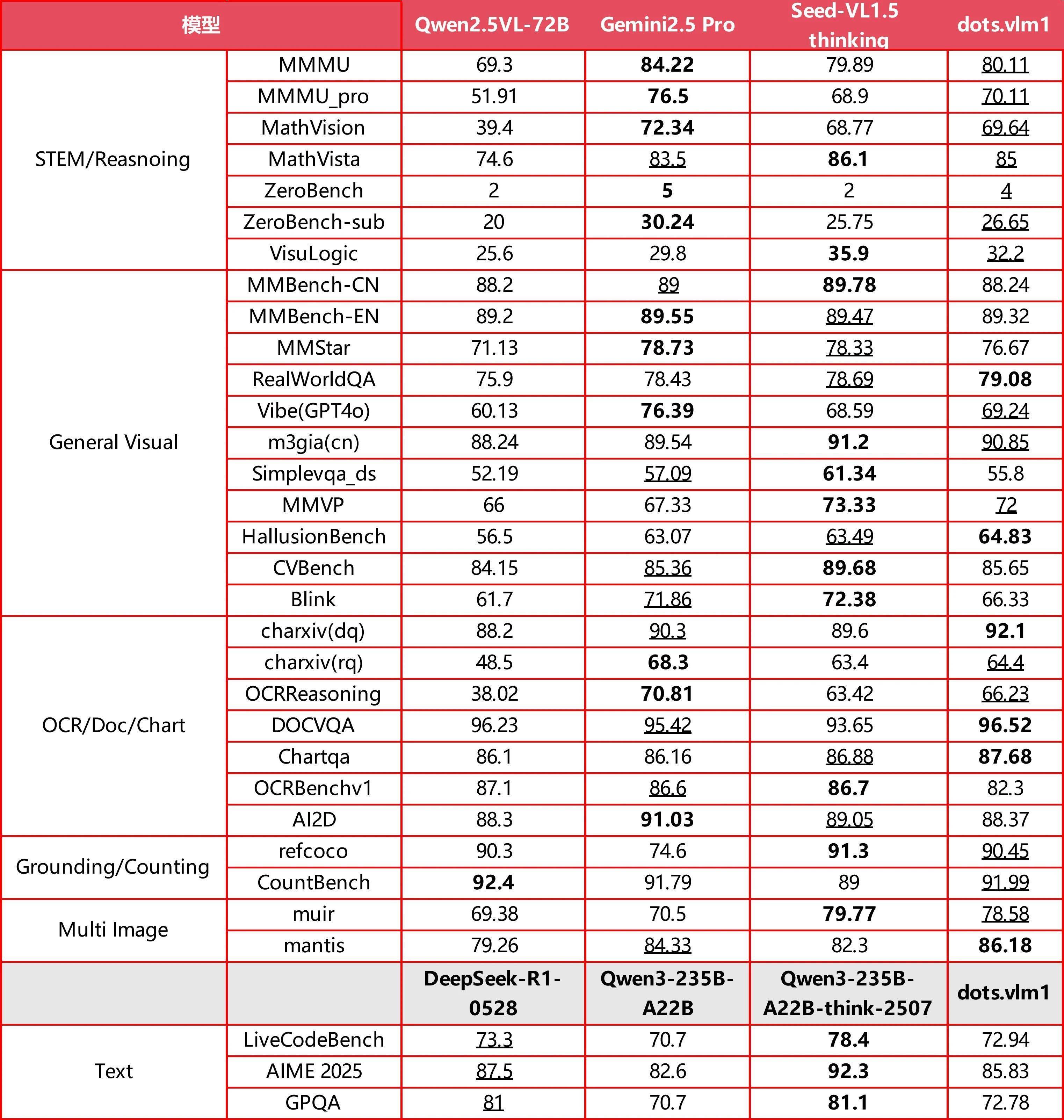 典型的文本推理任务(如 AIME、GPQA、LiveCodeBench)上,dots.vlm1 的表现大致相当于 DeepSeek-R1-0528,在数学和代码能力上已具备一定的通用性,但在 GPQA 等更多样的推理任务上仍存在差距。