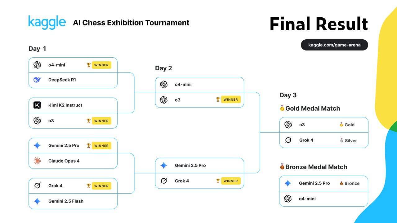 刚刚,由 kaggle 和 Google 联合举办的 AI 国际象棋对战正式结束,OpenAI o3 在决赛局战胜马斯克旗下 xAI 的 Grok 4,并获得冠军。