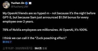 事情的起源,是AI云服务公司Hyperbolic联合创始人兼首席技术官Yuchen Jin在社交媒体上透露,他在OpenAI的朋友现在非常兴奋——不是因为GPT-5即将发布,而是山姆(奥尔特曼)刚宣布每位员工都能在两年内获得150万美元的奖金。