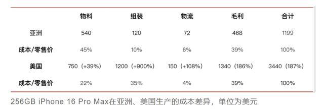 按照苹果之前的数据,一台售价1199美元的256GB iPhone16 Pro Max,其物料为540美元,占比45%,组装120美元,占比10%,物流72美元,占6%,然后还有39%的毛利(468美元)。