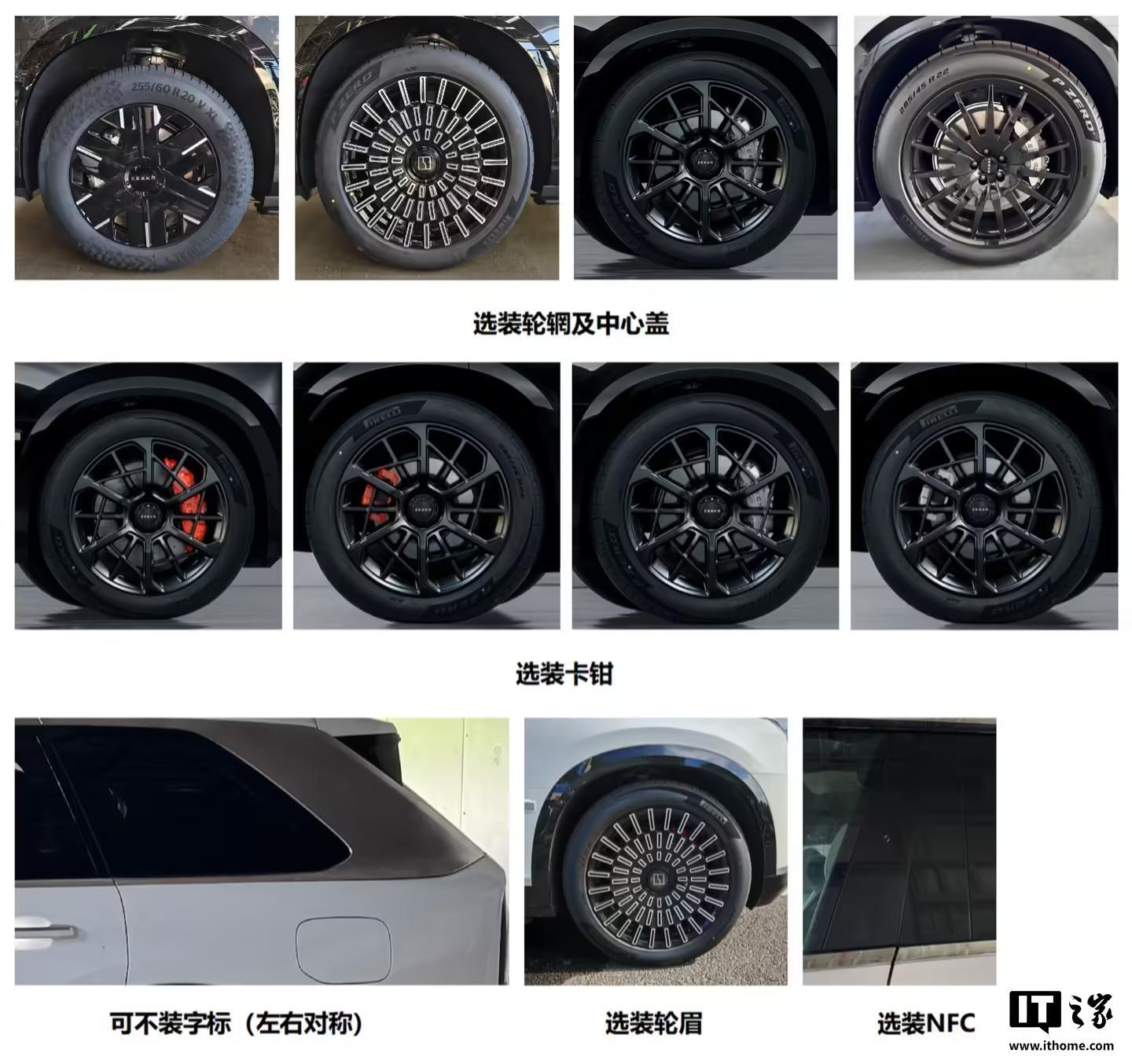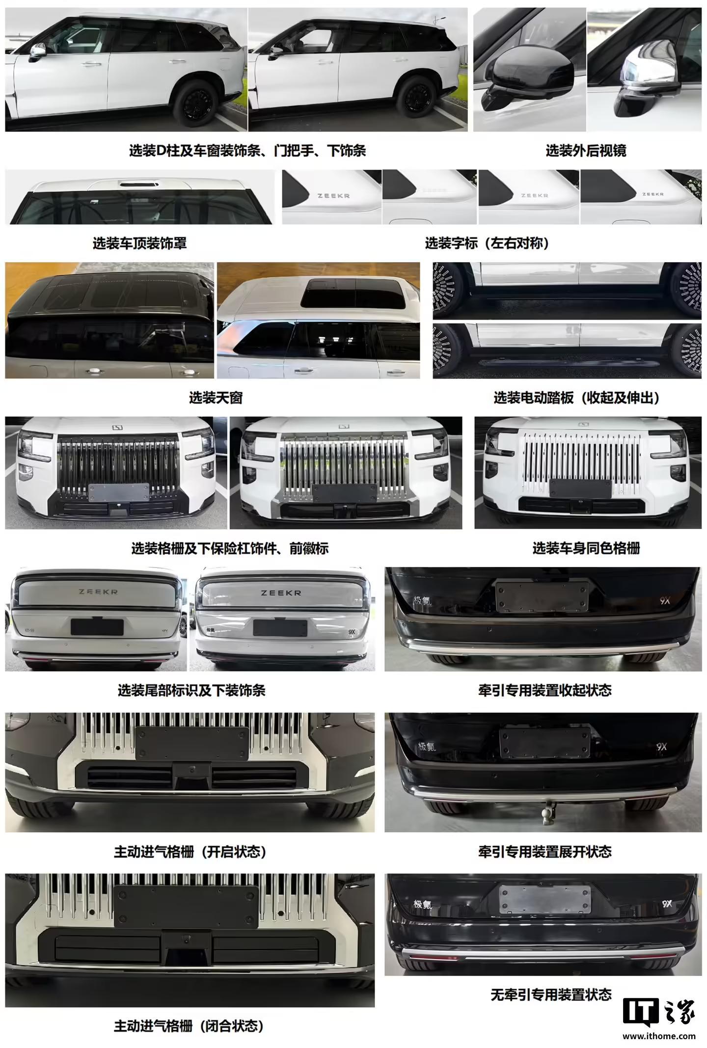 极氪 9X 可选装 D 柱及车窗装饰条、门把手、下饰条、外后视镜、车顶装饰罩、字标、天窗、电动踏板、格栅及下保险杠饰件、前徽标、车身同色格栅、尾部标识及下装饰条、轮辋及中心盖、卡钳、轮眉、NFC、牵引专用装置等。