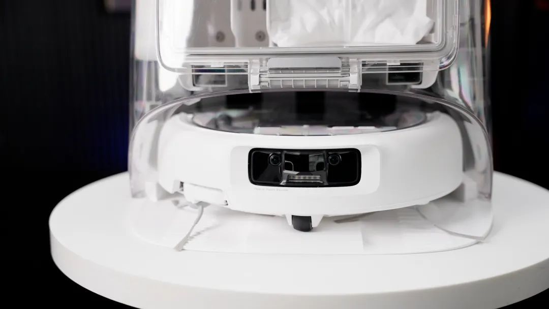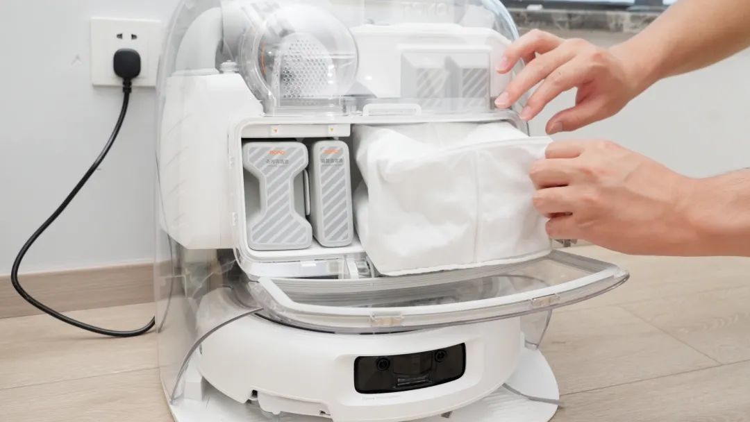 我们手里的是大疆扫地机 ROMO P 旗舰版,它跟其他两个版本最大的区别,就是扫地机人本体和基站都做成了透明外壳。这样从外面一眼就能看到扫地机的风道、尘盒,以及基站的去污清洁液 & 除菌清洁液的投放仓,还有基站自集尘的尘袋。