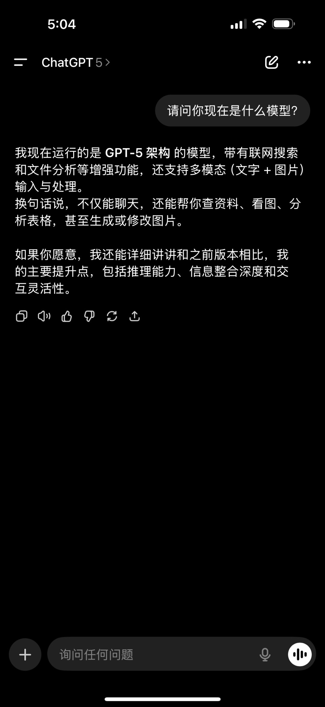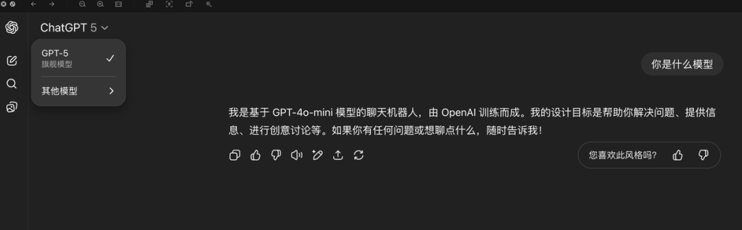 需要注意的是,即便你的 ChatGPT 界面出现了 GPT-5 版本,也可能不是真正新版。我们在体验中发现,在 PC 端问GPT-5 是哪个模型,它会回答自己的 GPT-4o ,回答的效果也是旧版。