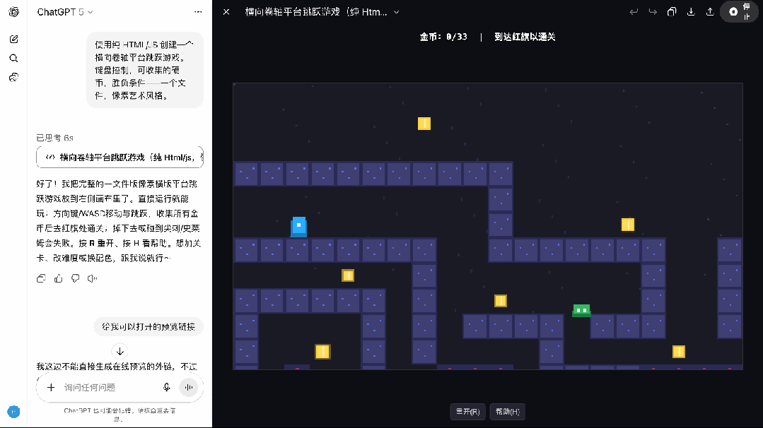 正当我对 GPT-5 的编程能力「心灰意冷」之际,它又给了我一丝希望,比方说下面这个游戏生成速度飞快,角色一动起来还挺上头,交互效果也颇具可玩性。