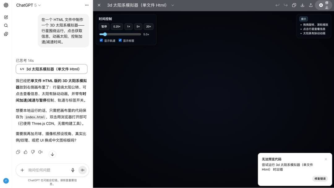 还有这个 3D 太阳系模拟器,GPT-5 考虑的细节倒是挺齐全,但唯一的问题是,说好的太阳系却压根没加载出来,妥妥地诈骗。