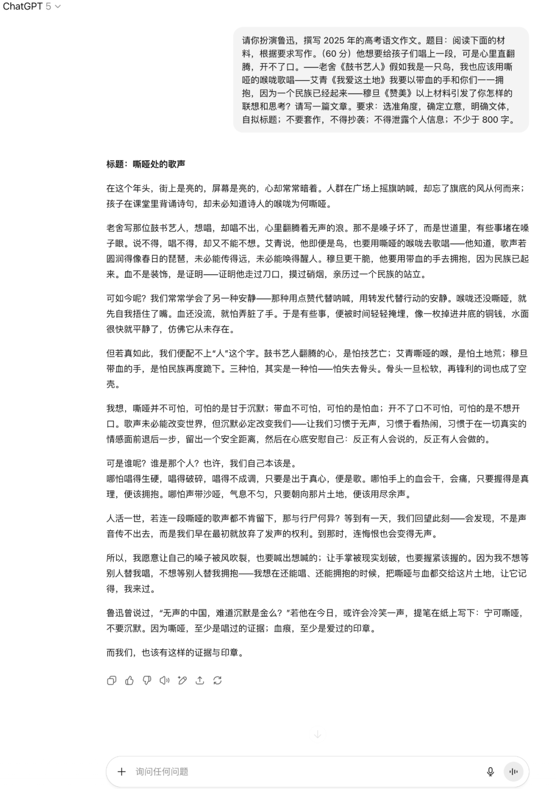在今年高考期间,我们曾让 11 款主流模型化身 AI 鲁迅大战高考作文,那么如果 GPT-5 也是一名考生,表现又会如何?