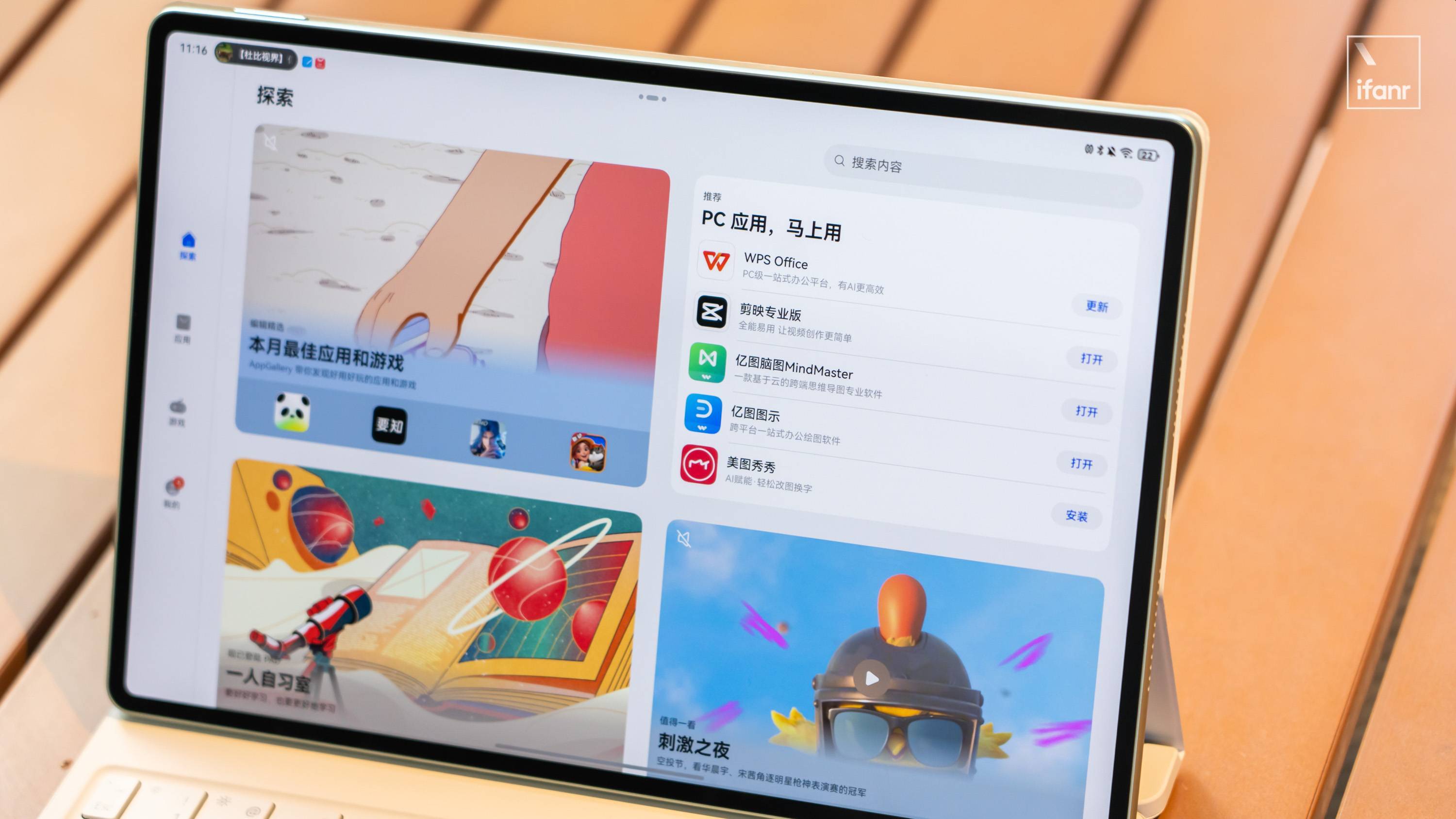 兼容方面,目前有不少常用的移动端应用已经推出了鸿蒙版本,应用市场已经有不少支持适配了鸿蒙系统的应用上架,有上面提到的 WPS Office、剪映专业版,常用的游戏王者荣耀、和平精英,以及之前在鸿蒙电脑推出时上线的应用都有上线兼容鸿蒙平板的版本。