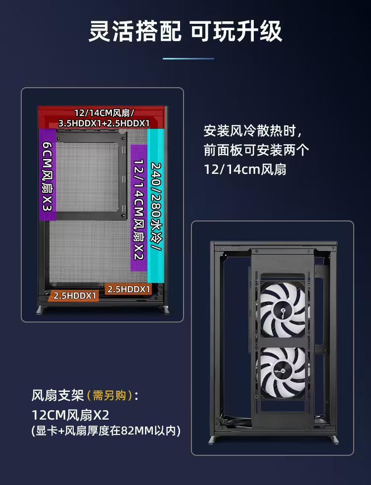 此外该机箱采用多面 MESH 开孔透风和模块化快拆设计,左右侧面板支持互换,提升了桌面布局适宜右侧透的用户的美学体验。
