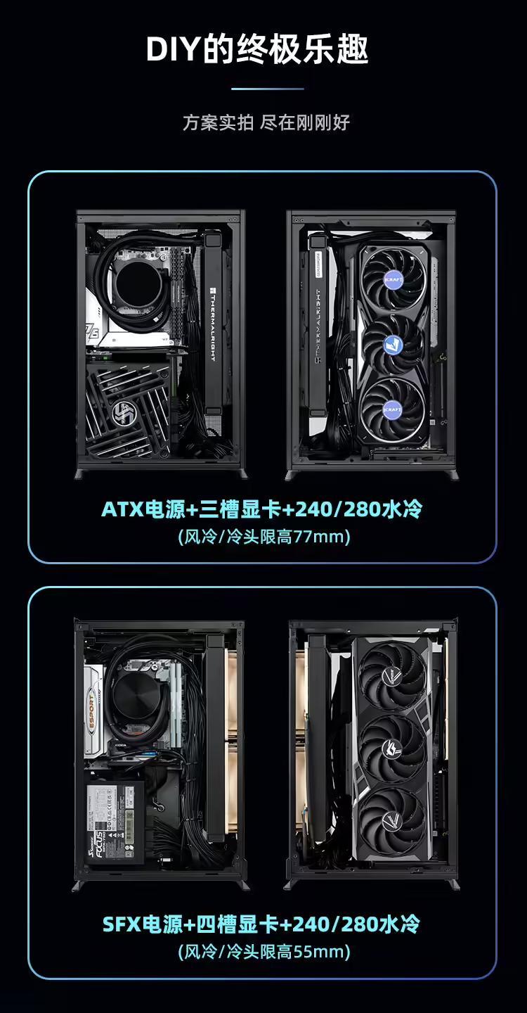 机械大师 iF16-T 兼容 360mm 长显卡,其一大特色是其可通过主板托盘支架的左右移动在标准 ATX 电源 + 三槽显卡 + 77mm 处理器散热限高 / SFX 电源 + 四槽显卡 + 55mm 处理器散热限高这两种布局中调整,提供更为灵活的硬件兼容性。