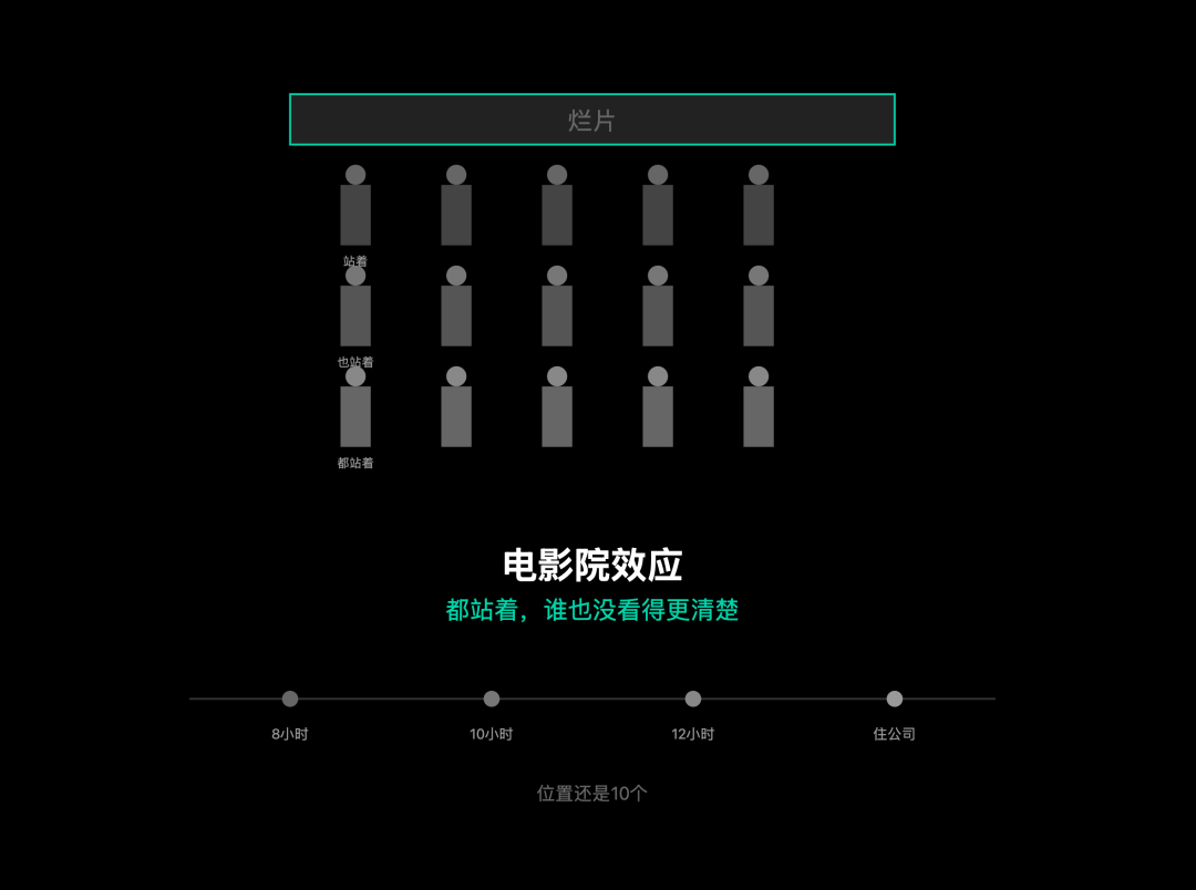 100个人抢10个位置。最开始8小时。后来9小时。10小时。11小时。12小时。有人开始住公司了。有人把床搬来了。位置还是10个。10个。